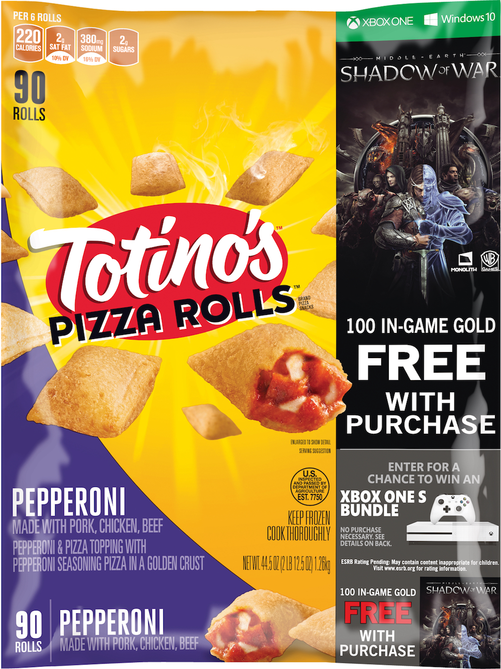The sweepstakes was not the only part of the program. Participants had a chance to turn in gold pieces, earned from codes on Totino’s Pizza Roll or Party Pizza boxes, to obtain exclusive content. When entered online the codes rewarded players with either 100 in-game gold for Middle-earth: Shadow of War and five days of Xbox Game Pass, 100 in-game gold, or 50 in-game gold.