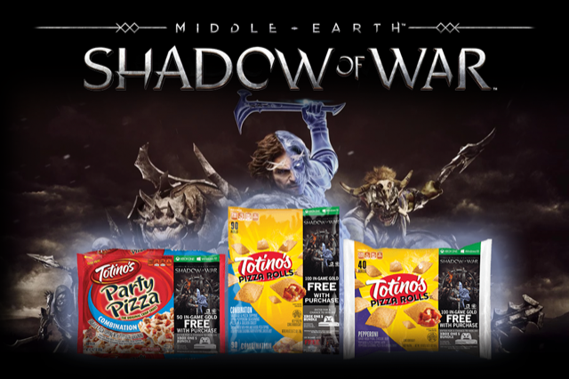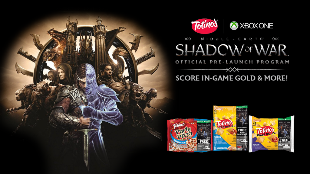 Totinos, Xbox, and WB Games teamed up for a sweepstakes where fans could win Middle-earth: Shadow of War prizes. The sweepstakes involved thirty grand prize winners that won an Xbox One S, an Xbox One controller, a t-shirt, and a digital copy of Middle-earth: Shadow of War on Xbox One. There were also two hundred and fifty second prize winners won a digital copy of the game on Xbox One and a Xbox Controller.