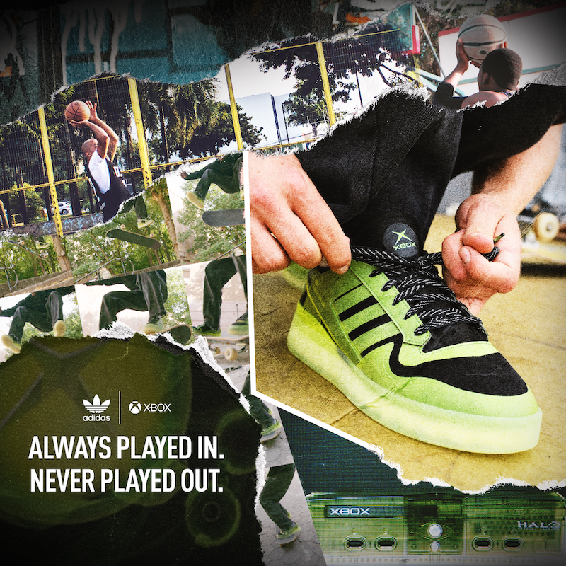 Xbox and adidas were excited to debut the partnership’s launch trailer “adidas Originals by Xbox – 20 Years of Play” which celebrates the era of play most prevalent when the first Xbox console launched in the early 2000s — skateboarding culture. Filmed and edited like a skate tape pulled straight from 2001, it followed a group of friends as they skate through their day in the Xbox 20th Forum Tech sneakers, pulling off tricks and playing some Halo: Combat Evolved on the original Xbox.