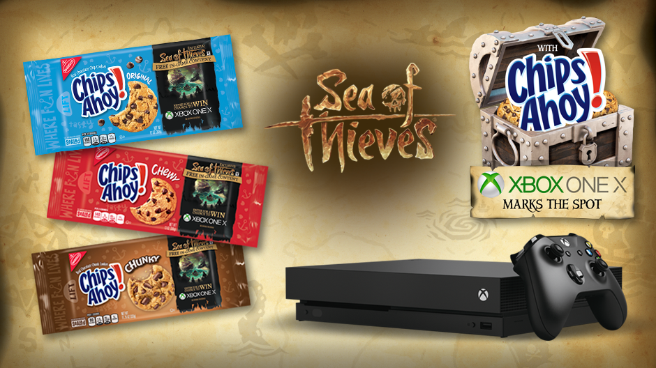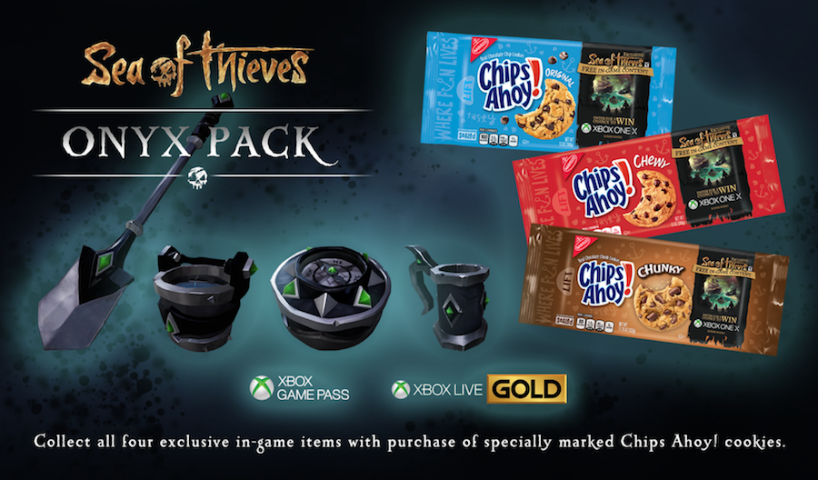 Xbox and Chips Ahoy! teamed up to offer exclusive Sea of Thieves in-game items. With the purchase of specially marked packages of Chips Ahoy! cookies, featuring unique Sea of Thieves art, consumers would receive digital codes. Once gamers entered the codes online they were awarded with exclusive in-game cosmetic gear. Items from the exclusive ‘Onyx Set’ helped gamers plot a course, dig up treasure, and bail out the lower decks in Sea of Thieves.